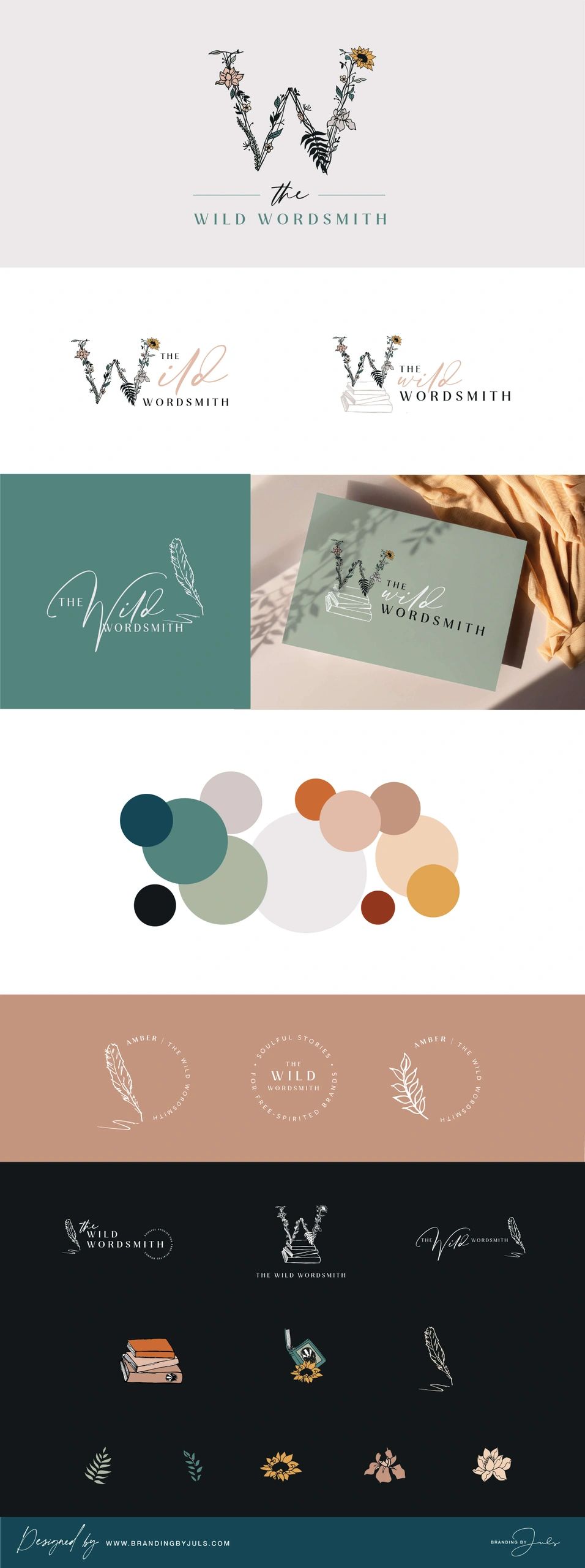This time I wanted to ensure Amber's branding felt as she put it '100% UNEQUIVOCALLY me.' Much of the creative direction and ideas just flowed out. I went with my gut instinct and what just felt right. I shared my initial sketches with Amber and from her excitement I knew we were on to a winner! The Letter W is hand illustrated and includes Amber's favourite flowers, the iris, sunflower and Lotus. I also wanted to include an element of Amber's writing into her branding which would also link to her soulful, free-spirited values. The hand illustrated feather fitted perfectly.